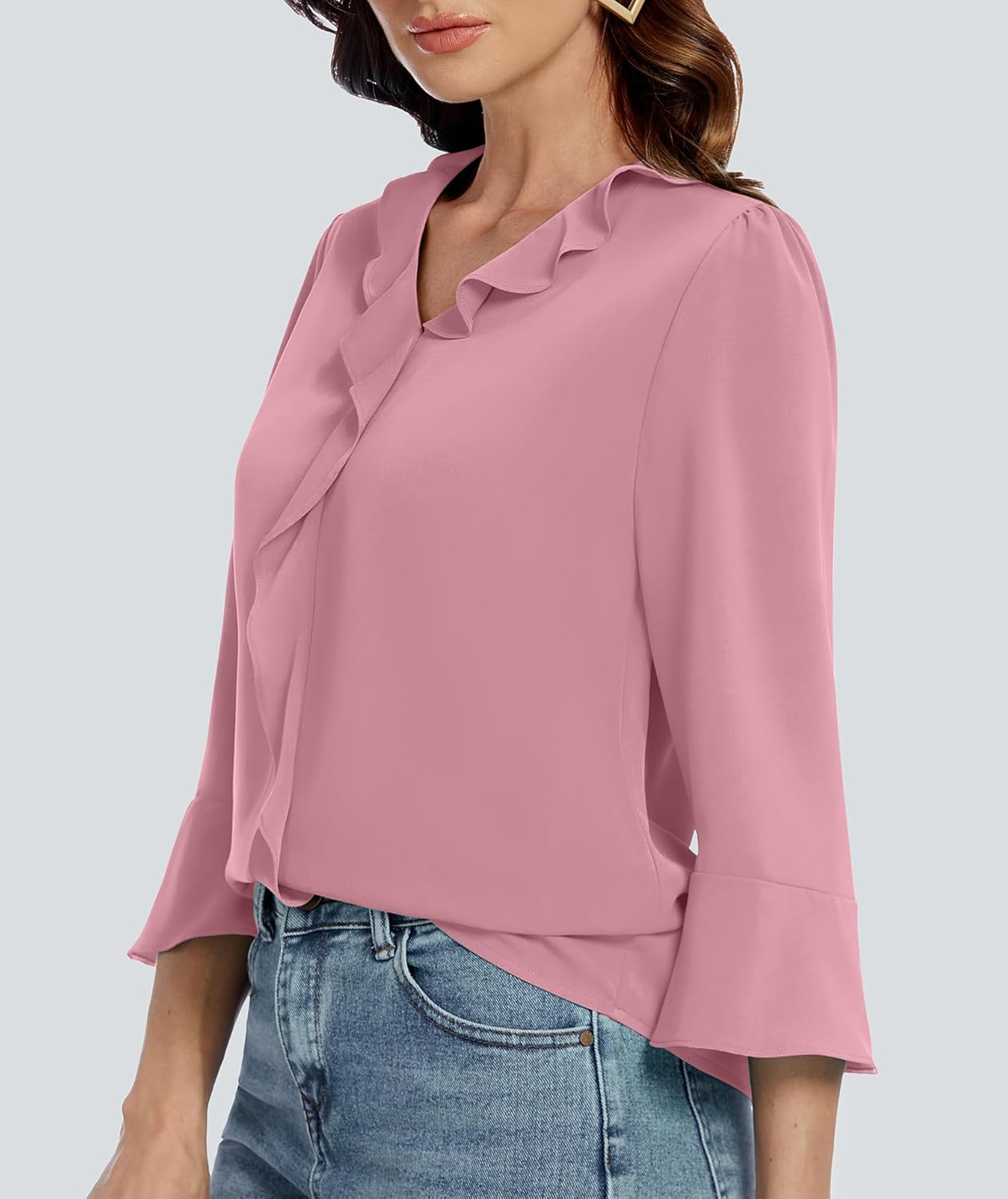 - Design: Womens business casual top is adorned with a v neck design, enhancing the neckline and slimming your face. Ruffle from neck to hem add a feminine touch to overall design. The flare 3/4 sleeves shape the outline of your arms and add elegance.