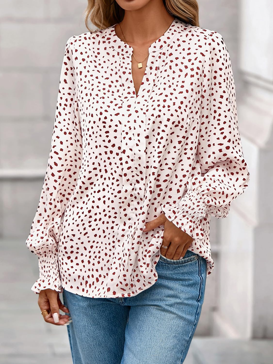 - Match: Pair the smocked sleeve womens tops with tailored pants for a business casual look, or jeans for a relaxed vibe. The dot printed/floral color options make it easy to mix and match, fitting perfectly into any ladies tops and blouses collection.