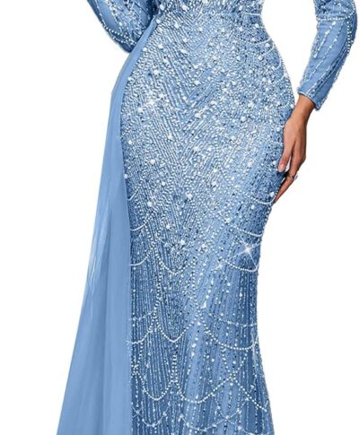Women Sequin Beaded Mermaid Formal Evening Gown Long Sleeve Prom Dress Bodycon Wedding Guest Party Cocktail Maxi Dress
