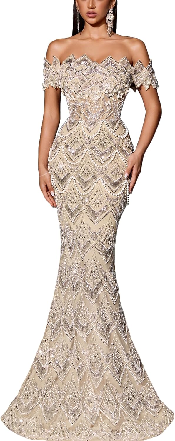 - Glamorous Sequin & Hand-Beaded Embellishment: This sequin beaded formal evening dress with premium shimmering sequins and exquisitely hand-sewn beads, this dress shimmers brilliantly from every angle, instantly elevating your glamour quotient. The mermaid prom dress features a charming off-the-shoulder design that highlights your collarbones and shoulder lines, exuding romantic and feminine charm. The classic mermaid cut fits snugly through the waist and hips,perfectly showing off your curves