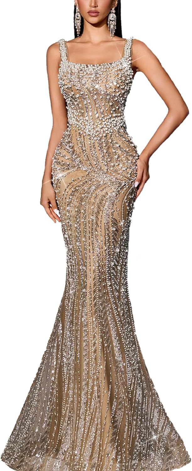 - Unique Design:Fully embellished with shimmering sequins and intricate beading, this gown reflects light beautifully for a glamorous, high-end look.Chic square neckline with delicate spaghetti straps enhances the collarbone and creates a modern, elegant silhouette perfect for formal occasions.Fitted through the hips with a dramatic mermaid hem, highlighting curves while offering a stunning, red-carpet-worthy finish.